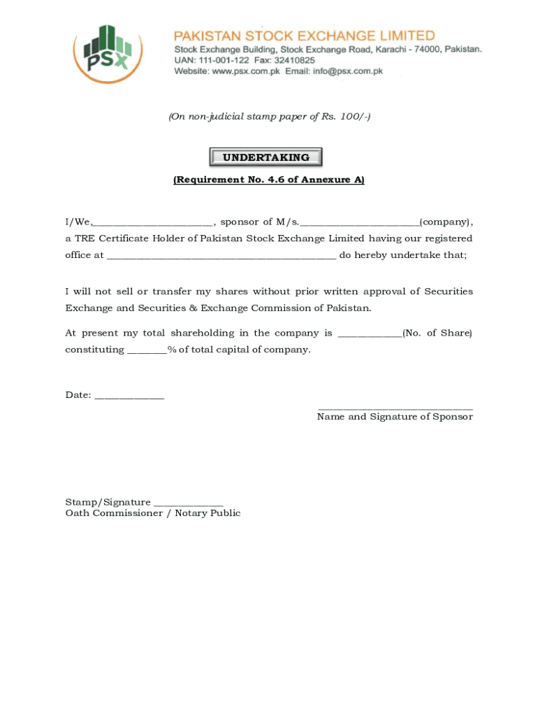 (On nonjudicial stamp paper of Rs. 100/)UNDERTAKING (Requirement No. 4.6 of Appendix A)I/We, ___, sponsor of M/s.___(company), a TRE Certificate Holder of Pakistan Stock Exchange Limited having our