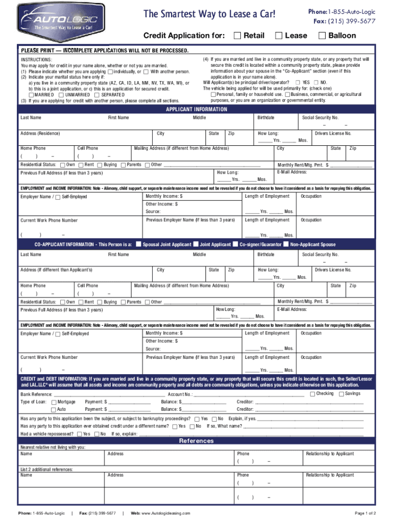 Phone:1855AutoLogic Fax: (215) 3995677The Smartest Way to Lease a Car! Credit Application for: Retail Lease BalloonPLEASE PRINT INCOMPLETE APPLICATIONS WILL NOT BE PROCESSED. INSTRUCTIONS: You may