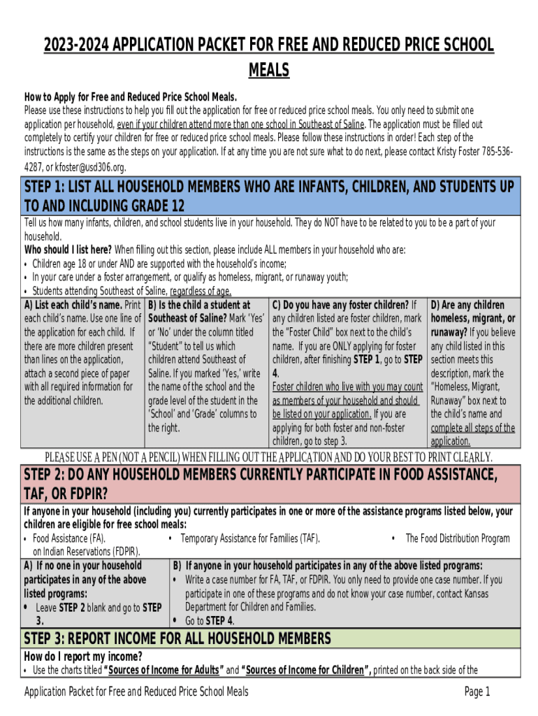 Template 2023-2024 APPLICATION PACKET FOR FREE AND REDUCED PRICE SCHOOL MEALS instructions