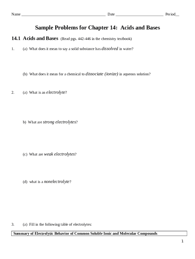 The AP Chemistry Practice Test: Ch. 14, Acids and Bases is a fillable form in MS Word extension that has to be completed and signed for certain purpose. Next, it is provided to the actual addressee in order to provide certain info of any kinds. The completion and signing is available manually or with an appropriate service like PDFfiller. Such tools help to submit any PDF or Word file without printing them out. It also allows you to edit its appearance for your needs and put legit digital signature. Upon finishing, the user sends the AP Chemistry Practice Test: Ch. 14, Acids and Bases to the recipient or several ones by email or fax. PDFfiller is known for a feature and options that make your Word form printable. It provides various settings when printing out. It doesn't matter how you'll deliver a form after filling it out - physically or by email - it will always look professional and clear. In order not to create a new writable document from scratch every time, turn the original file as a template. Later, you will have an editable sample.