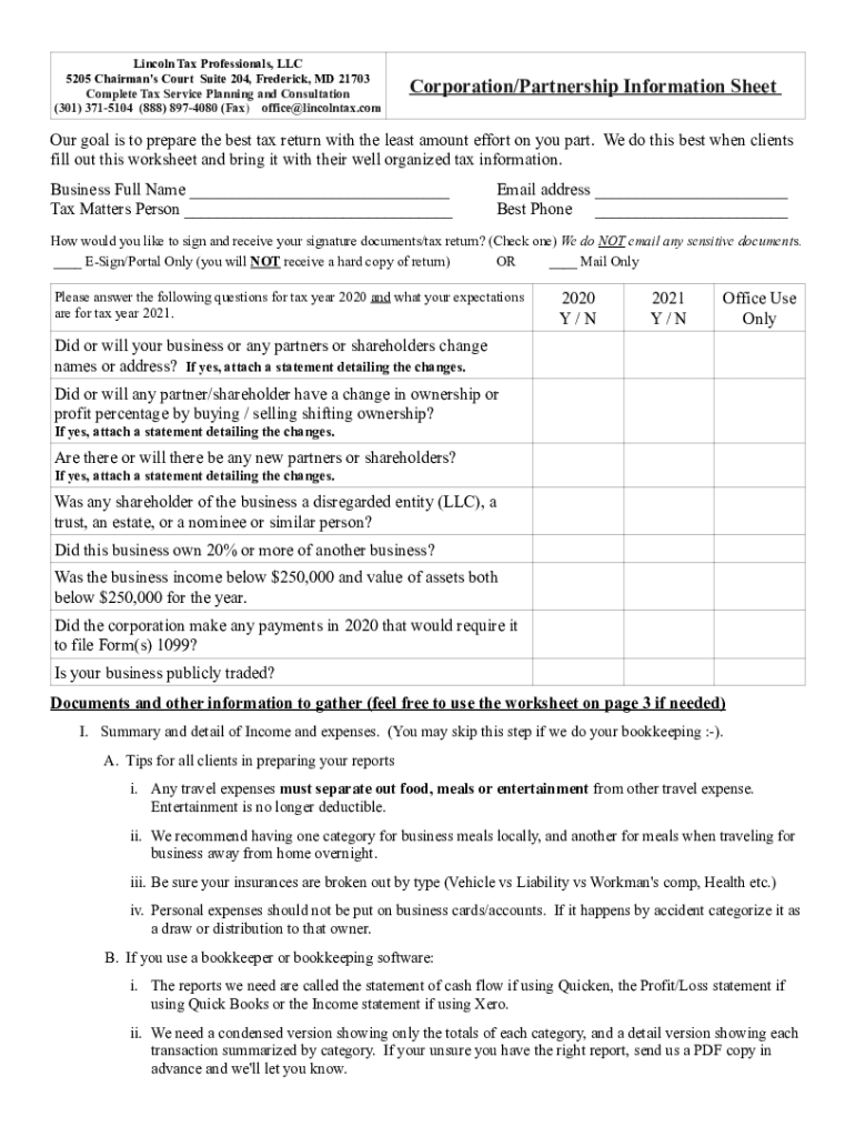 Lincoln Tax Professionals, LLC 5205 Chairman\'s Court Suite 204, Frederick, MD 21703 Complete Tax Service Planning and Consultation (301) 3715104 (888) 8974080 (Fax) office@lincolntax.comCorporation/Partnership
