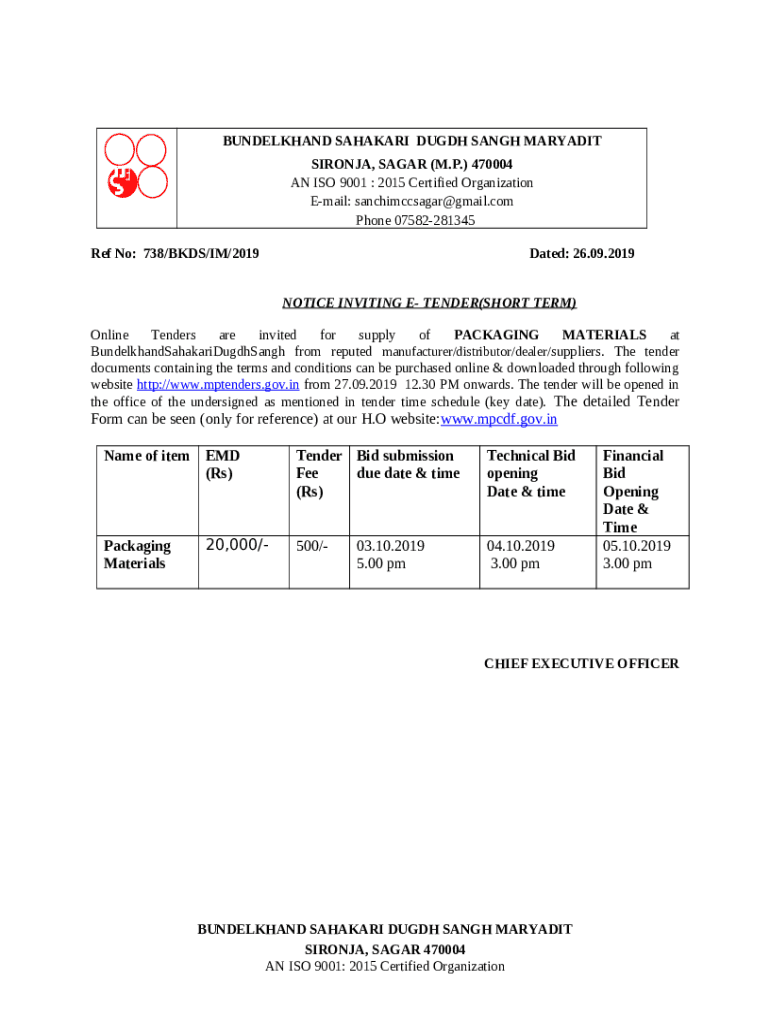 The NOTICE INVITING E- TENDER(SHORT TERM) is a Word document that should be submitted to the specific address to provide certain info. It needs to be filled-out and signed, which is possible manually, or via a certain software e. g. PDFfiller. It helps to complete any PDF or Word document right in the web, customize it depending on your requirements and put a legally-binding e-signature. Once after completion, you can send the NOTICE INVITING E- TENDER(SHORT TERM) to the relevant person, or multiple recipients via email or fax. The template is printable as well from PDFfiller feature and options proposed for printing out adjustment. Both in electronic and physical appearance, your form will have got neat and professional appearance. You may also save it as the template to use later, there's no need to create a new file from the beginning. You need just to edit the ready form.