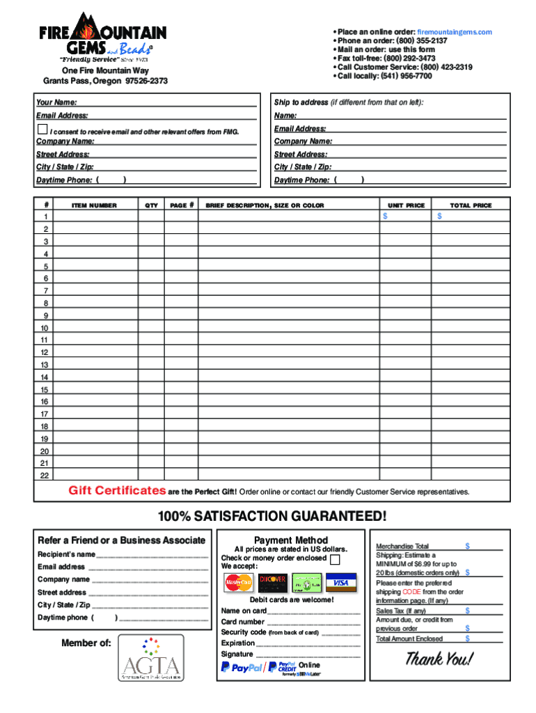 One Fire Mountain Way Grants Pass, Oregon 975262373Your Name:Ship to address (if different from that on left):Email Address:Name: I consent to receive email and other relevant offers from FMG. Email
