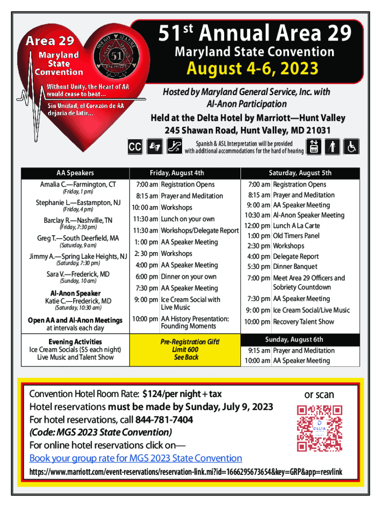 51st Annual Area 29 Maryland State Convention August 46, 2023Hosted by Maryland General Service, Inc. with Alan Participation Held at the Delta Hotel by Marriott Hunt Valley 245 Shawn Road, Hunt Valley,