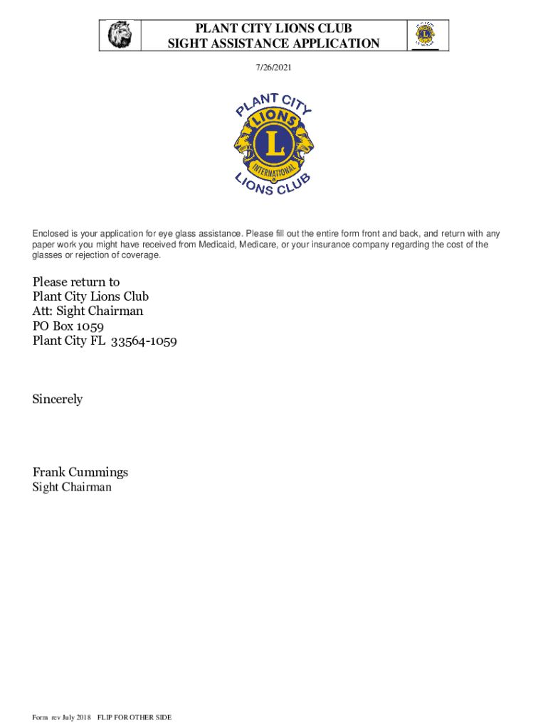 7/26/2021Enclosed is your application for eye glass assistance. Please fill out the entire form front and back, and return with any