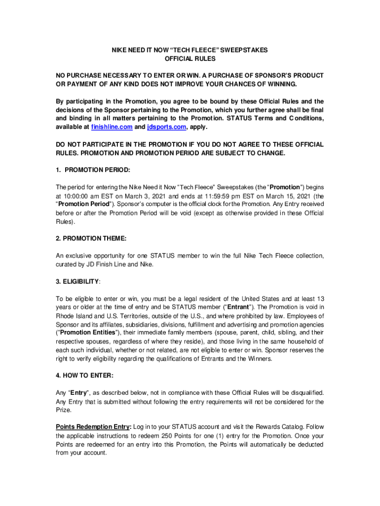 NIKE NEED IT NOW Teach FLEECE SWEEPSTAKES OFFICIAL RULES NO PURCHASE NECESSARY TO ENTER OR WIN. A PURCHASE OF SPONSORS PRODUCT OR PAYMENT OF ANY KIND DOES NOT IMPROVE YOUR CHANCES OF WINNING. By participating