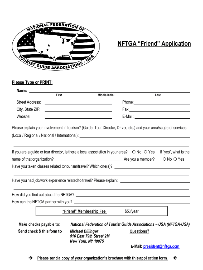FirstMiddle InitialLastStreet Address:Phone:City, State ZIP:Fax:Website:Email:Please explain your involvement in tourism? (Guide, Tour Director,
