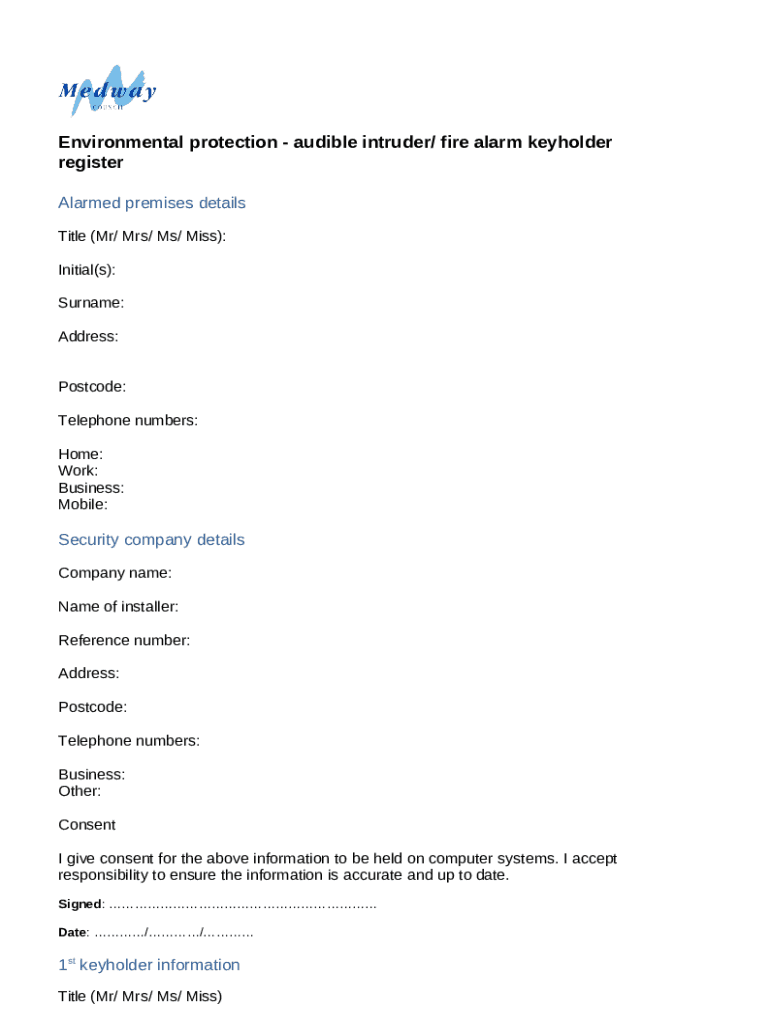 - Find the Audible Intruder/Fire Alarm Key Holder Register - Medway Council form in PDFfiller’s catalogue.