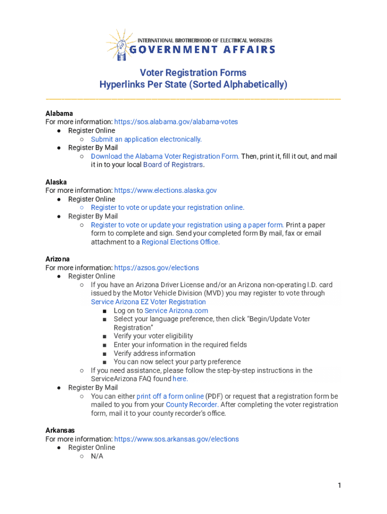 Voter Registration Forms Hyperlinks Per State (Sorted Alphabetically) ___ Alabama For more information: https://sos.alabama.gov/alabamavotes Register Online Submit an application electronically. Register