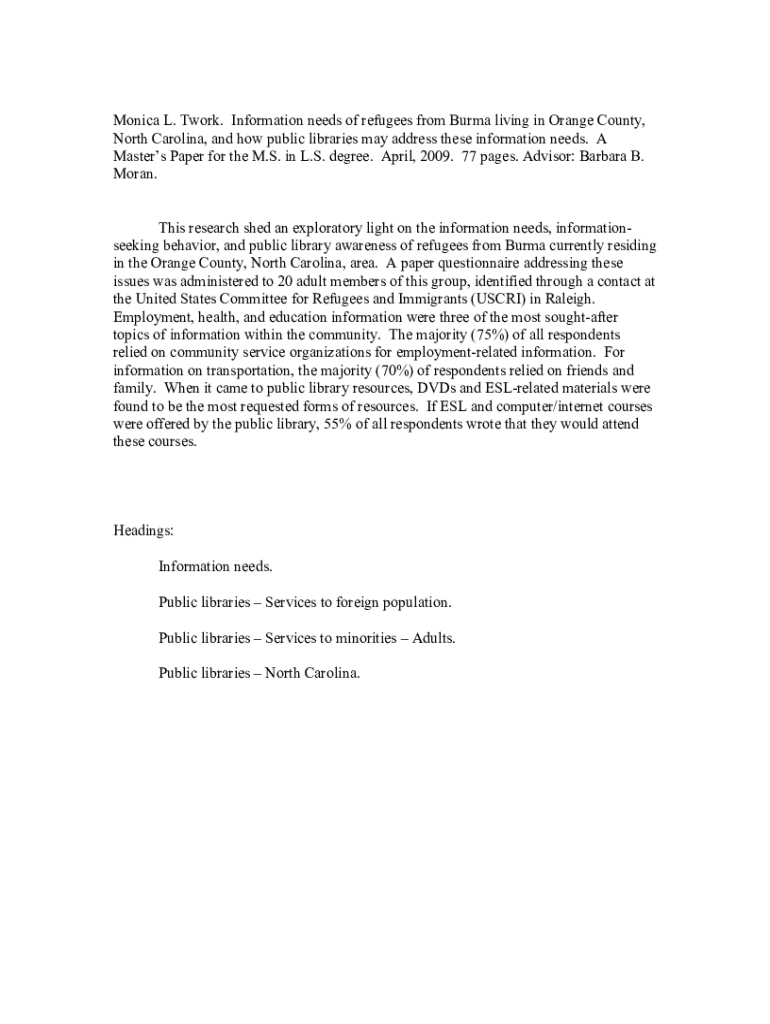 Monica L. Work. Information needs of refugees from Burma living in Orange County, North Carolina, and how public libraries may address these information needs. A Masters Paper for the M.S. in L.S.