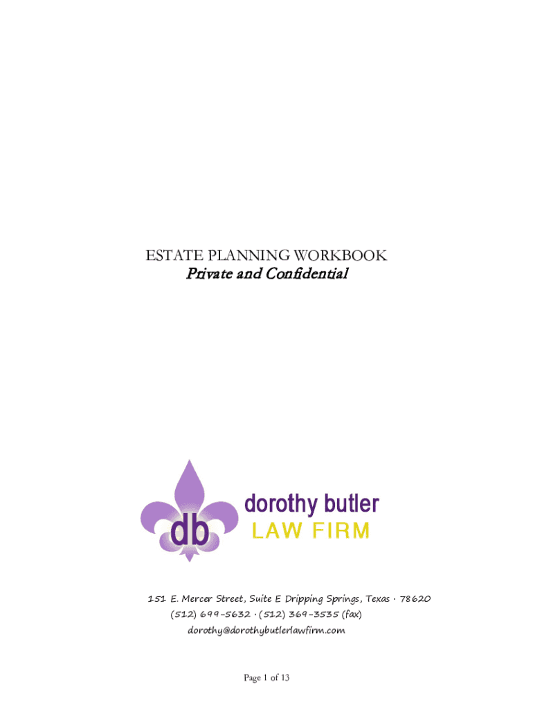 ESTATE PLANNING WORKBOOK Private and Confidential151 E. Mercer Street, Suite E Dripping Springs, Texas 78620 (512) 6995632 (512) 3693535 (fax) dorothy@dorothybutlerlawfirm.comPage 1 of 13PERSONAL