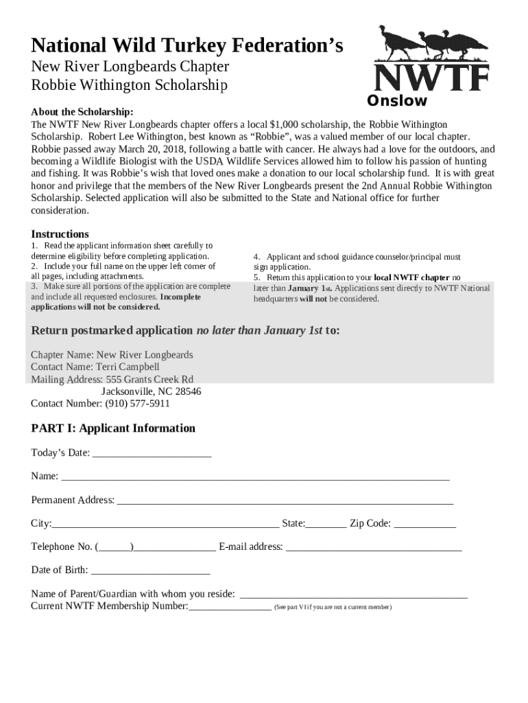 The National Wild Turkey Federation's is a Word document that should be submitted to the specific address in order to provide certain information. It needs to be completed and signed, which is possible manually in hard copy, or via a certain solution e. g. PDFfiller. This tool lets you fill out any PDF or Word document directly from your browser (no software requred), customize it depending on your purposes and put a legally-binding electronic signature. Right after completion, the user can send the National Wild Turkey Federation's to the appropriate person, or multiple recipients via email or fax. The blank is printable as well thanks to PDFfiller feature and options proposed for printing out adjustment. Both in digital and physical appearance, your form should have a organized and professional outlook. It's also possible to turn it into a template for later, so you don't need to create a new blank form from scratch. You need just to edit the ready document.