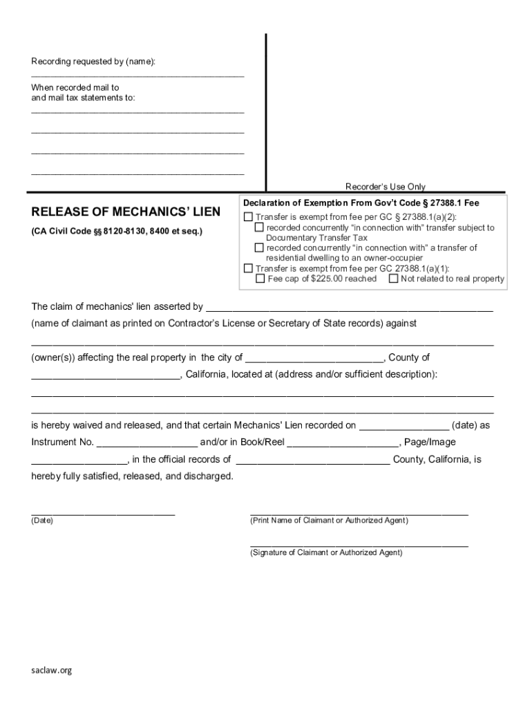 Recording requested by (name): ___ When recorded mail to and mail tax statements to: ___ ___ ___ ___ Recorders Use OnlyRELEASE OF MECHANICS LIEN (CA Civil Code 81208130, 8400 et seq.)Declaration of