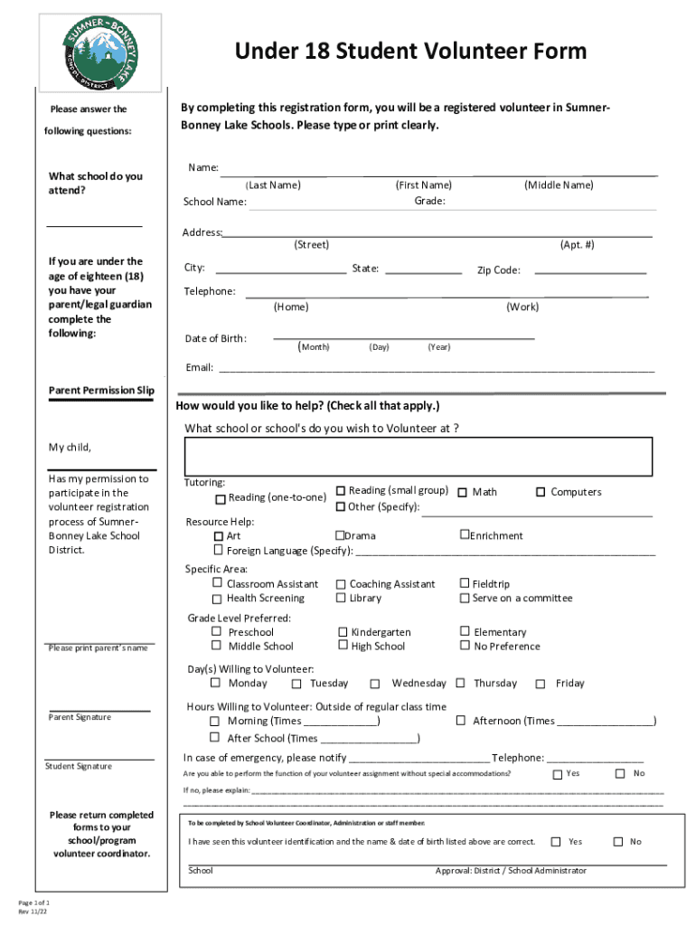 Under 18 Student Volunteer Form By completing this registration form, you will be a registered volunteer in SumnerBonney Lake Schools. Please type or print clearly.Please answer the following questions:Name:What