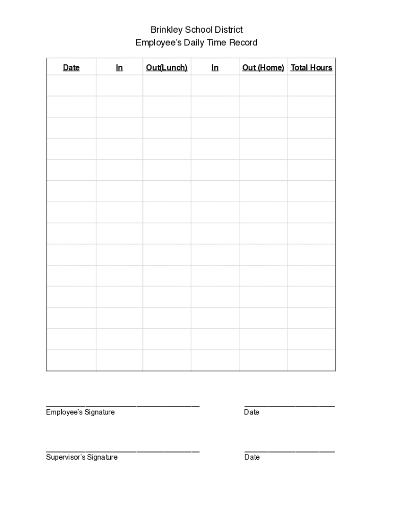 Brinkley School District Employees Daily Time Record DateInOut(Lunch)InOut (Home) Total Hours___ Employees Signature___ Date___ Supervisors Signature___ Date