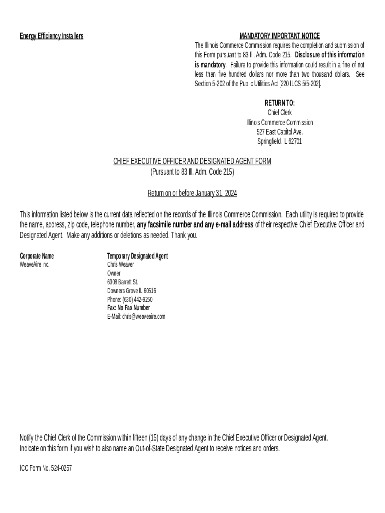 The WeaveAire Inc is a Word document that should be submitted to the specific address to provide certain info. It has to be completed and signed, which may be done in hard copy, or using a particular software such as PDFfiller. This tool allows to fill out any PDF or Word document directly in your browser, customize it according to your purposes and put a legally-binding electronic signature. Once after completion, user can easily send the WeaveAire Inc to the relevant person, or multiple individuals via email or fax. The editable template is printable as well due to PDFfiller feature and options presented for printing out adjustment. In both digital and physical appearance, your form should have a organized and professional outlook. It's also possible to turn it into a template for further use, so you don't need to create a new blank form again. All you need to do is to customize the ready sample.