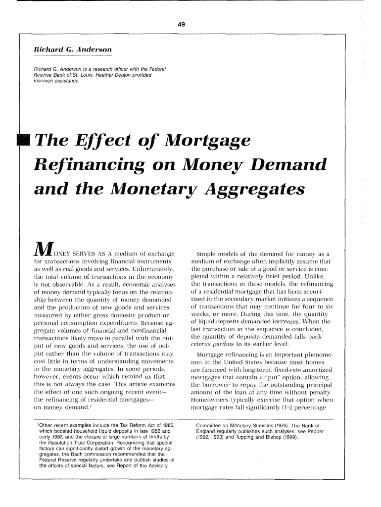 49 Richard C. Anderson Richard phi Anderson is a research officer with the Federal Reserve Bank of St. Louis. Heather Eaton provided research assistance The Effect of Mortgage Refinancing on Money