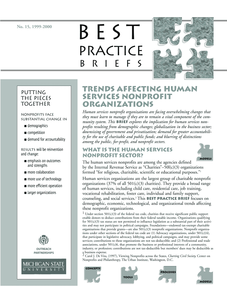 No. 15, 19992000bestpractice b r i e f putting THE PIECES TOGETHER nonprofits face substantial change in demographics competition demand for accountability results will be reinvention and change: