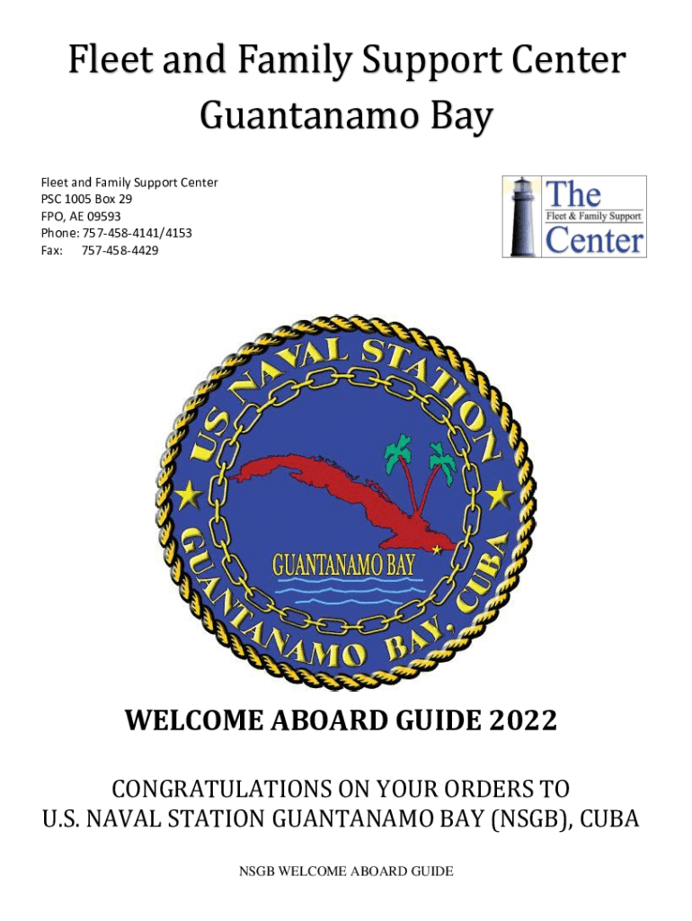 Fleet and Family Support Fleet and Family Supercenter Center Guantanamo Bay Fleet and Family Support Center PSC 1005 Box 29 FPO, AE 09593 Phone: 7574584141/4153 Fax: 7574584429WELCOME ABOARD GUIDE