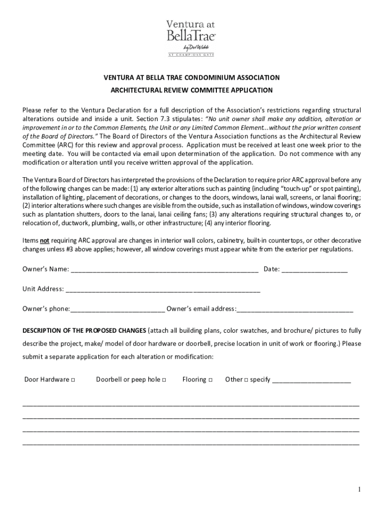 VENTURA AT BELLA TRAE CONDOMINIUM ASSOCIATION ARCHITECTURAL REVIEW COMMITTEE APPLICATION Please refer to the Ventura Declaration for a full description of the Associations restrictions regarding structural