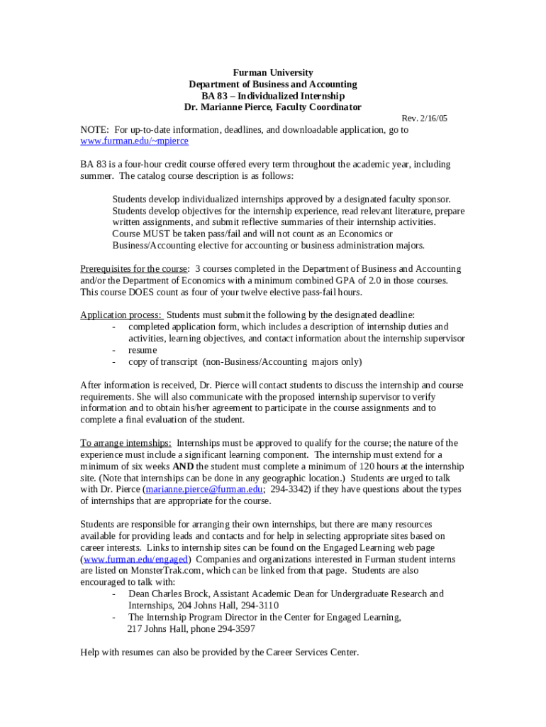 What is BA 83Individualized Internship (4 hours credit) - facweb furman Form?