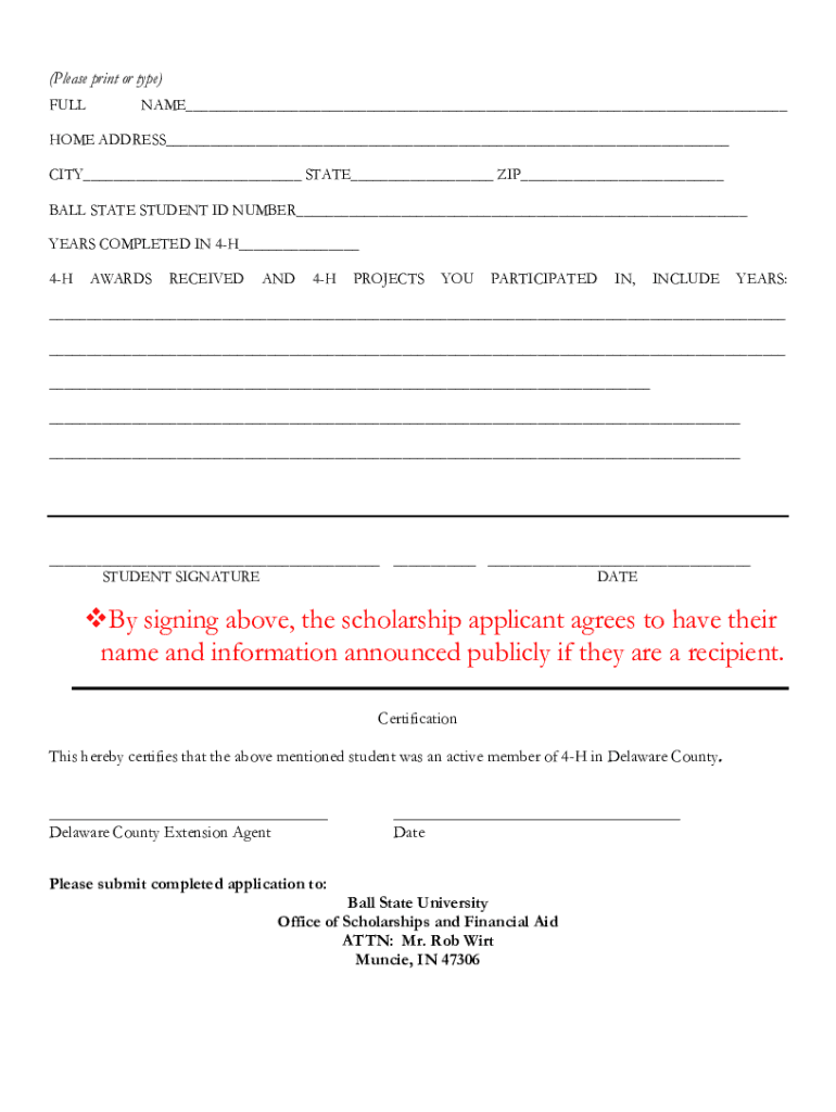 Get the free Scholarship for Ball State 4-H students from Delaware ... - extension purdue