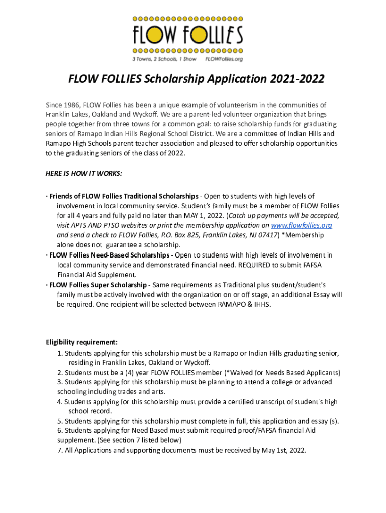 FLOW FOLLIES Scholarship Application Since , FLOW Follies has been a unique example of volunteerism in the communities of Franklin Lakes, Oakland and Wyckoff. We are a parentled volunteer organization