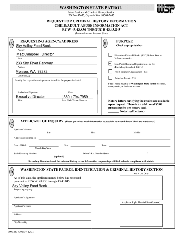 PO Box 42633, Olympia WA 985042633RESETREQUEST FOR CRIMINAL HISTORY INFORMATION