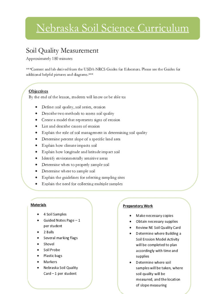 Nebraska Soil Science Curriculum Soil Quality Measurement Approximately 180 minutes ***Content and lab derived from the USDANRCS Guides for Educators. Please see the Guides for additional helpful