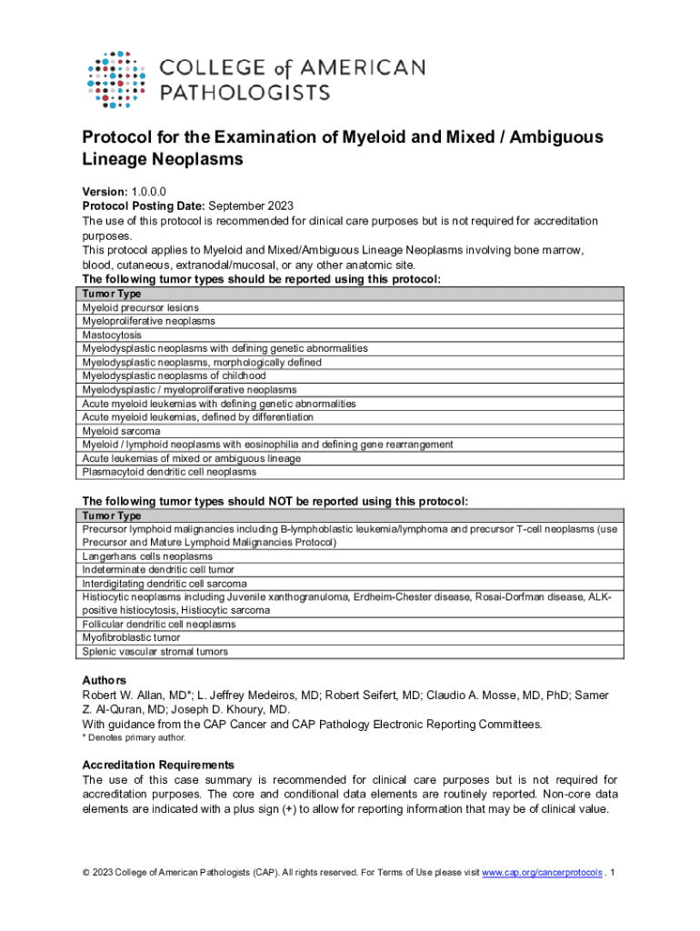 Protocol for the Examination of Myeloid and Mixed / Ambiguous Lineage Neoplasms Version: 1.0.0.0 Protocol Posting Date: September 2023 The use of this protocol is recommended for clinical care purposes