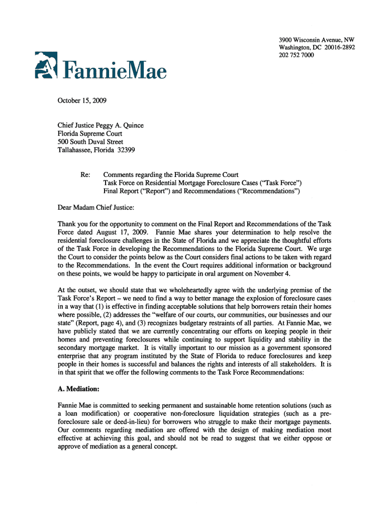 FannieMae3900 Wisconsin Avenue, NW Washington, DC 200162892 2027527000October 15,2009Chief Justice Peggy A. Quince Florida Supreme Court 500 South Duval Street Tallahassee, Florida 32399Re:Comments