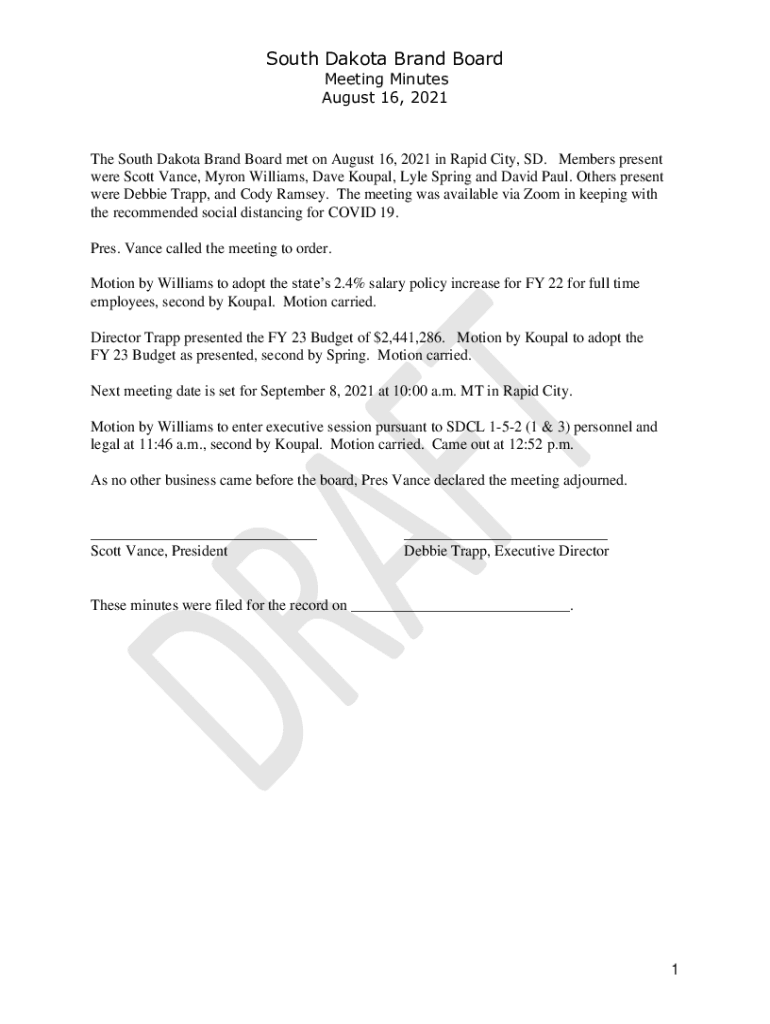 South Dakota Brand Board Meeting Minutes August 16, 2021The South Dakota Brand Board met on August 16, 2021 in Rapid City, SD. Members present were Scott Vance, Myron Williams, Dave Koupal, Lyle Spring