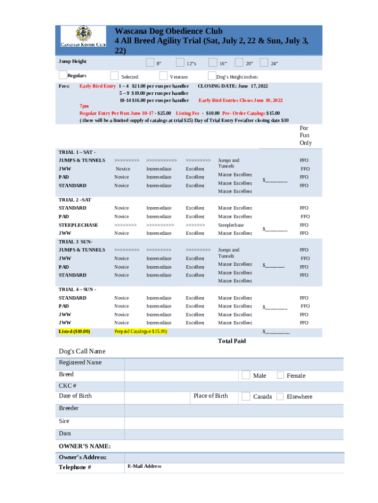 Wascana Dog Obedience Club 4 All Breed Agility Trial (Sat ... template instructions