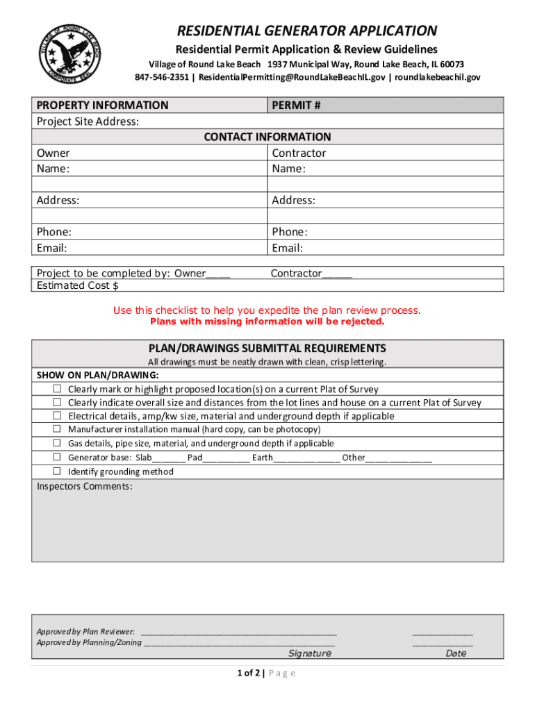 RESIDENTIAL GENERATOR APPLICATION Residential Permit Application & Review Guidelines Village of Round Lake Beach 1937 Municipal Way, Round Lake Beach, IL 60073 8475462351 | ResidentialPermitting@RoundLakeBeachIL.gov