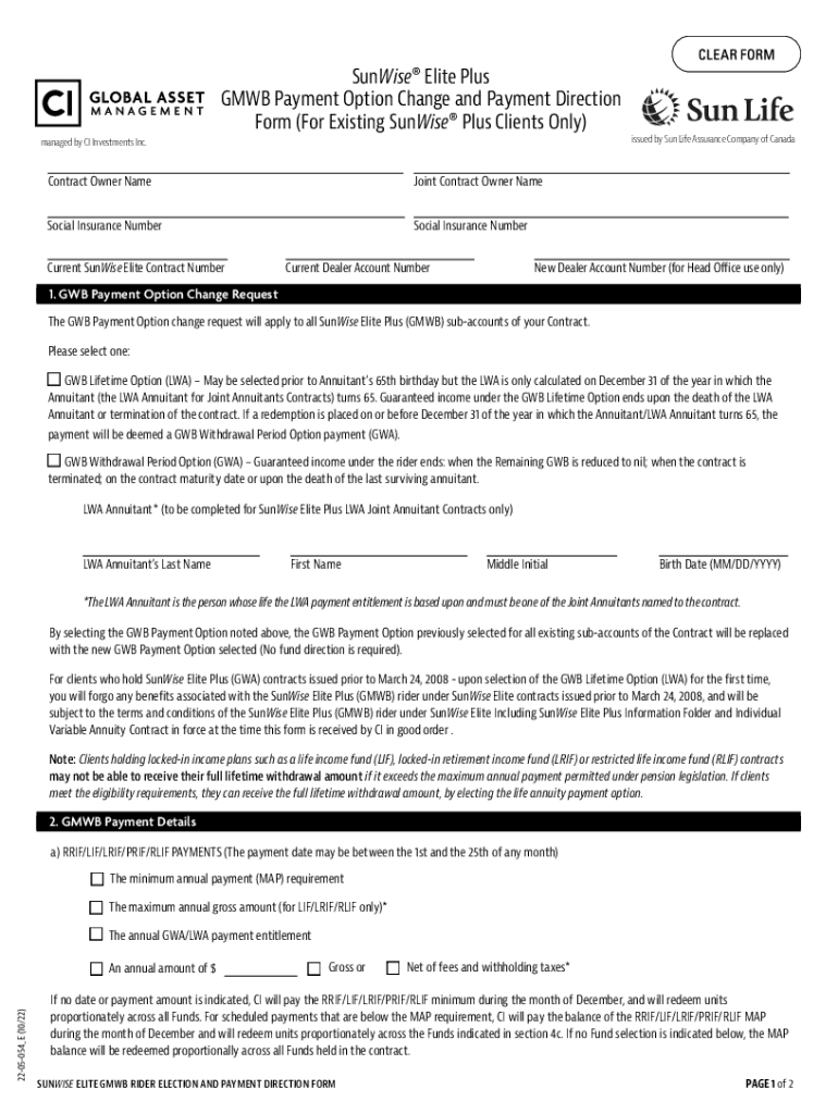 SunWise Elite Plus GMB Payment Option Change and Payment Direction Form (For Existing SunWise Plus Clients Only) managed by Investments Inc. Contract Owner Adjoint Contract Owner Asocial Insurance