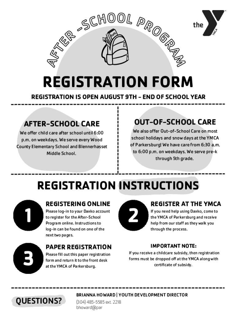 MAFTEOGRARO O L PR H C SREGISTRATION FORM REGISTRATION IS OPEN AUGUST 9TH END OF SCHOOL YEARAFTERSCHOOL CARE We offer child care after school until 6:00 p.m. on weekdays. We serve every Wood County