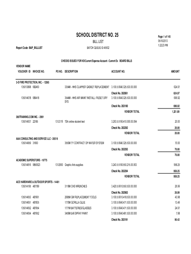 SCHOOL DISTRICT NO. 25Page: 1 of 145 05/10/2013 1:22:23 PMBILL LIST BATCH QUEUE ID 45502Report Code: BAP_BILLLISTCHECKS ISSUED FOR KB Current Expense Account Current Ex BOARD BILLS VENDOR NAME VOUCHER
