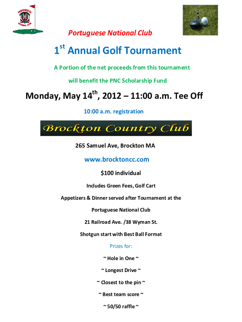 Portuguese National Club st1 Annual Golf Tournament A Portion of the net proceeds from this tournament will benefit the PNC Scholarship FundMonday, May 14th, 2012 11:00 a.m. Tee Off 10:00 a.m. registration265