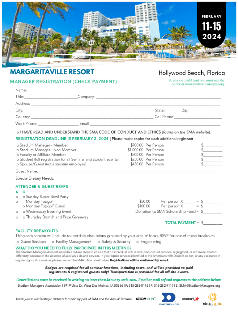 To pay via credit card, you must register online at www.stadiummanagers.org.MANAGER REG STRATI O N (CH E CK PAY M ENT)Name:___ Title:___Company:___ Address:___ City: ___ State: ___ Zip: ___ Country:___