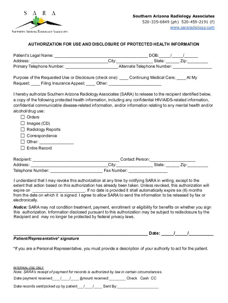 Southern Arizona Radiology Associates 5203356849 (ph) 5204592191 (f) www.sararadiology.comAUTHORIZATION FOR USE AND DISCLOSURE OF PROTECTED HEALTH INFORMATION Patients Legal Name: ___ DOB:___/___/___