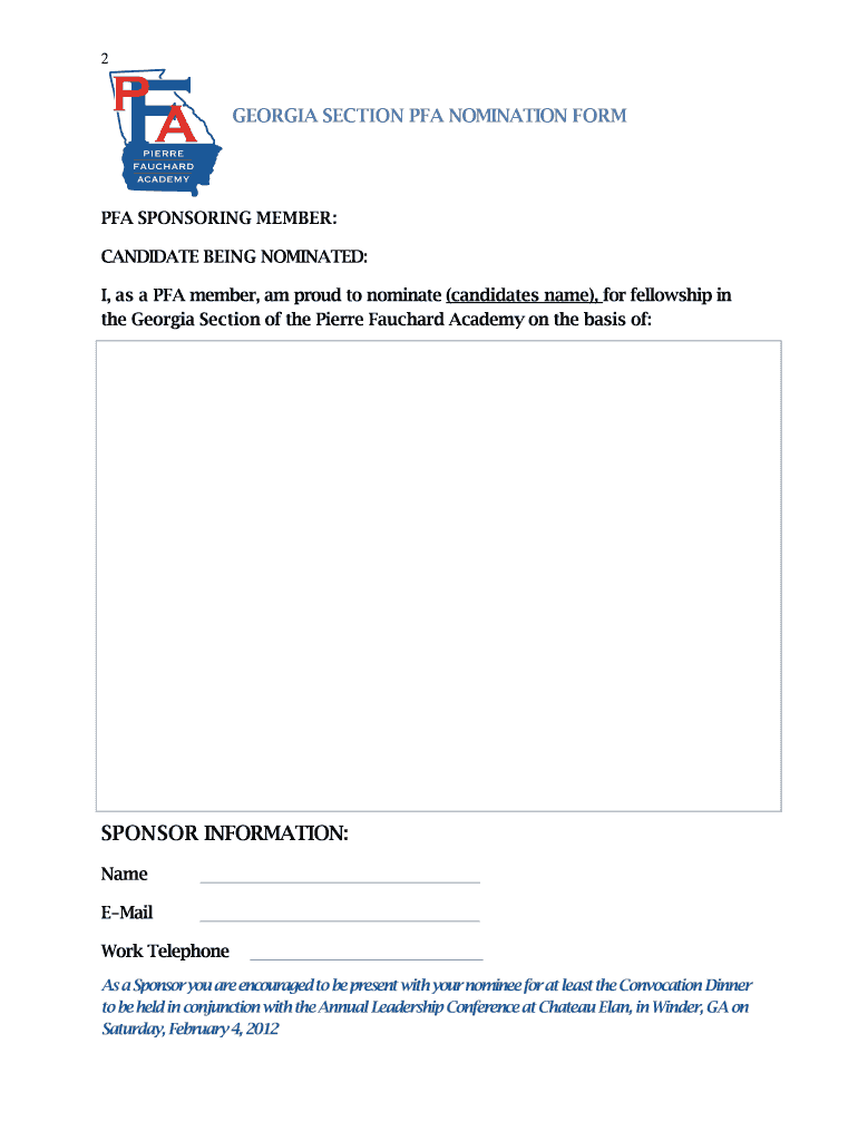 1 INFORMATION FOR THE NOMINATION OF CANDIDATES FOR FELLOWSHIP IN THE GEORGIA SECTION PFA Thank you for your support and interest in the Pierre Bouchard Academy, Georgia Section. In the interest of