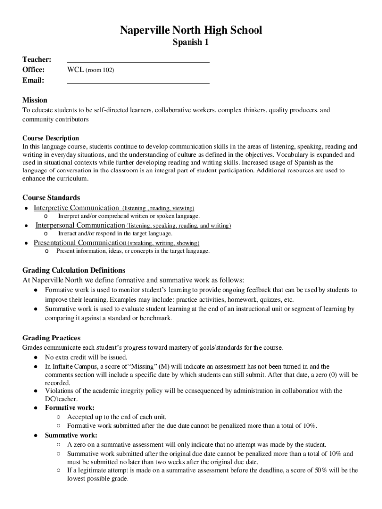 Naperville North High School Spanish 1 Teacher: Office: Email:___ WCL (room 102) ___Mission To educate students to be selfdirected learners, collaborative workers, complex thinkers, quality producers,