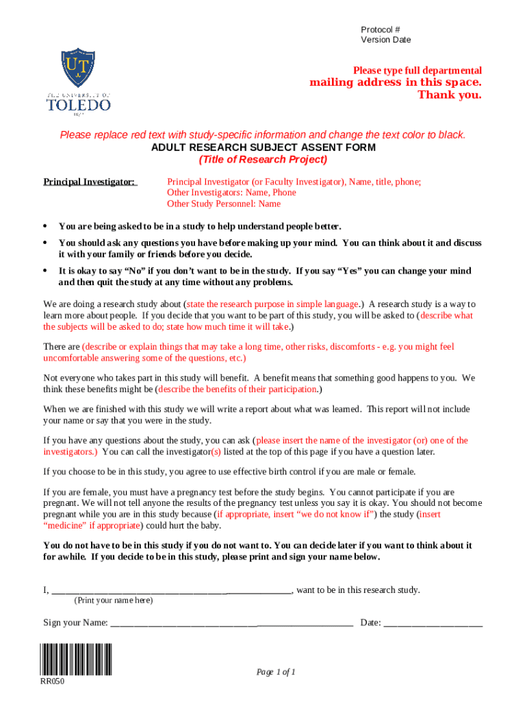 The NGIRB youth assent template - Research at UCalgary is a writable document required to be submitted to the relevant address in order to provide some information. It has to be filled-out and signed, which can be done manually, or with a particular solution e. g. PDFfiller. It allows to complete any PDF or Word document right in the web, customize it according to your purposes and put a legally-binding electronic signature. Right after completion, the user can easily send the NGIRB youth assent template - Research at UCalgary to the relevant receiver, or multiple ones via email or fax. The editable template is printable as well thanks to PDFfiller feature and options offered for printing out adjustment. In both digital and in hard copy, your form will have a clean and professional appearance. Also you can save it as the template for later, without creating a new file from the beginning. All you need to do is to edit the ready template.