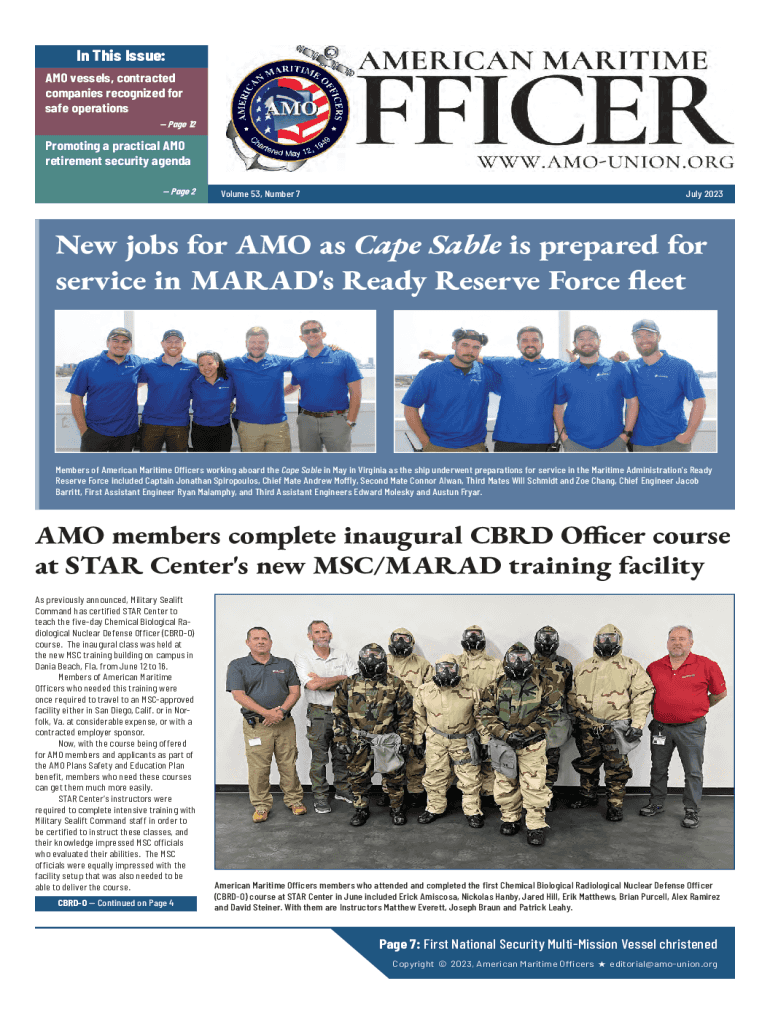 In This Issue: AMO vessels, contracted companies recognized for safe operations Page 12Promoting a practical AMO retirement security agenda Page 2Volume 53, Number 7July 2023New jobs for AMO as Cape