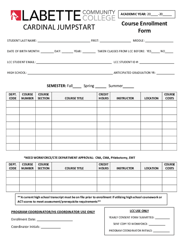 ACADEMIC YEAR: 20Course Enrollment FormCARDINAL JUMPSTART STUDENT LAST NAME:FIRST:DATE OF BIRTH MONTH:DAY:YEAR:MIDDLE:TAKEN CLASSES FROM LCC BEFORE: YESLCC STUDENT EMAIL:LCC STUDENT ID #:HIGH SCHOOL:ANTICIPATED