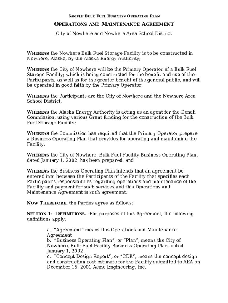 Template Business Operating Plan of the Nowhere Bulk Fuel Facility instructions