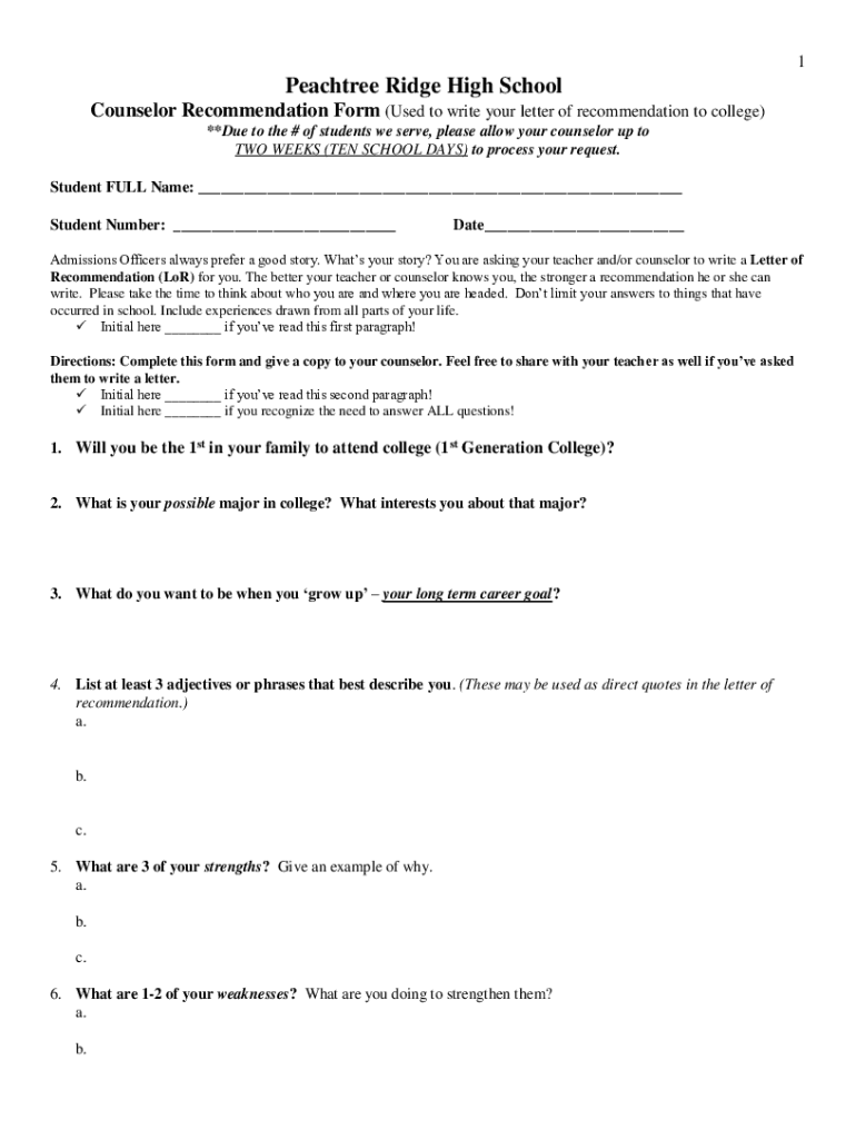 1Peachtree Ridge High School Counselor Recommendation Form (Used to write your letter of recommendation to college) **Due to the # of students we serve, please allow your counselor up to TWO WEEKS