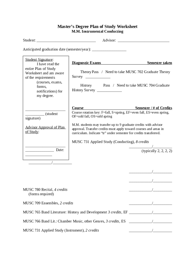 The Plan of Study Worksheet - M.M.M.E. is a Word document which can be filled-out and signed for specific purposes. Then, it is furnished to the relevant addressee to provide specific info and data. The completion and signing may be done manually in hard copy or with an appropriate service e. g. PDFfiller. Such services help to send in any PDF or Word file without printing them out. It also lets you edit its appearance depending on the needs you have and put a legal e-signature. Once finished, the user ought to send the Plan of Study Worksheet - M.M.M.E. to the respective recipient or several recipients by mail and even fax. PDFfiller includes a feature and options that make your blank printable. It includes a number of options for printing out. It doesn't matter how you'll file a document - in hard copy or electronically - it will always look professional and clear. In order not to create a new writable document from scratch again and again, make the original document into a template. Later, you will have an editable sample.