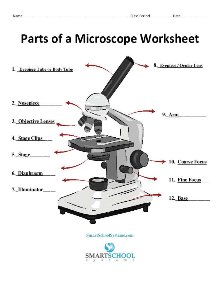 Name ___ Class Period ___ Date ___Parts of a Microscope Worksheet 8._Eyepiece / Ocular Lens1. _Eyepiece Tube or Body Tube2._Nosepiece___ ___ 9._Arm___ ___3._Objective Lenses 4._Stage Clips ___ 5._Stage___