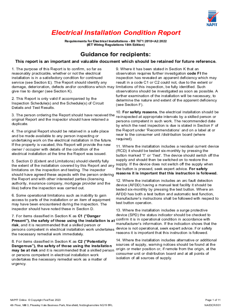 Electrical Installation Condition Report Requirements for Electrical Installations BS 7671:2018+A2:2022 (IET Wiring Regulations 18th Edition)Guidance for recipients: This report is an important and